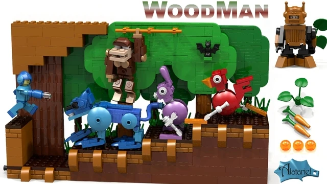 The WoodMan stage with all enemies MegaMan encounters in this stage including the big cat, rabbit, chicken and monkey robots. The set includes the WoodMan Robot Master and a set of weapons including the big cat's fire balls. (Yes, WoodMan throws leaves and the rabbit shoots carrots.... :)